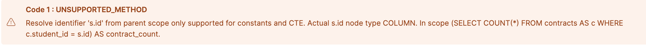 - 위 쿼리를 클릭하우스에서 실행하면 부모 쿼리의 컬럼을 서브쿼리에서 참조할 수 없다는 에러 문구가 발생한다.